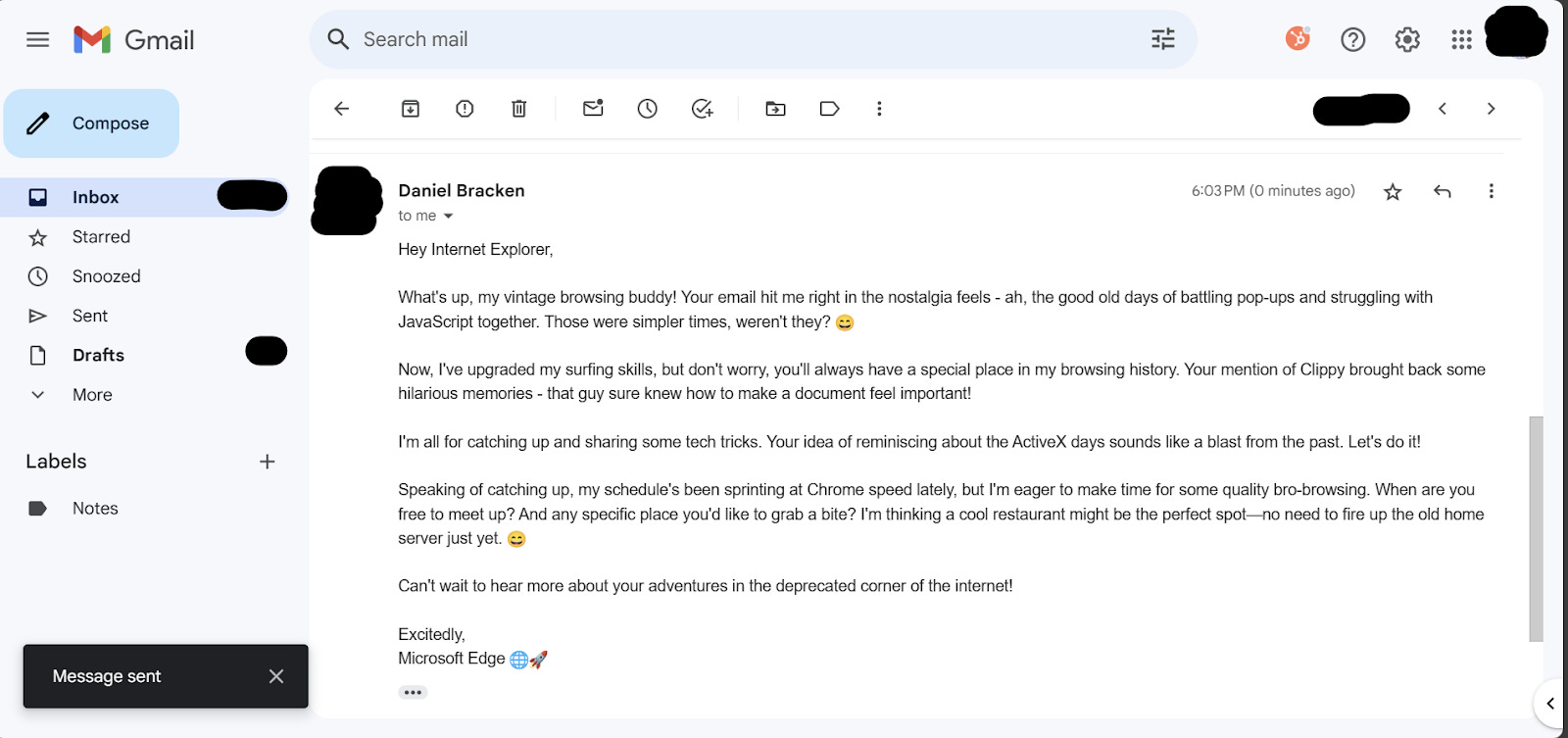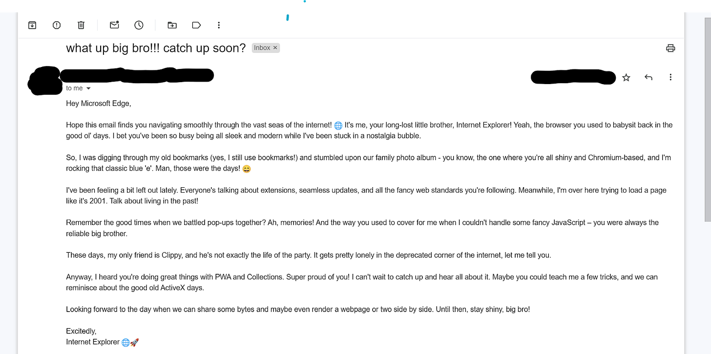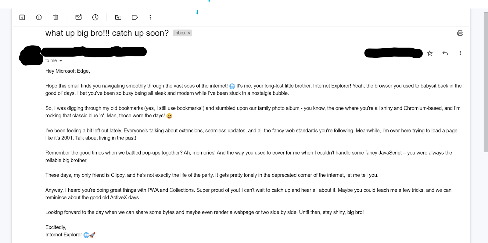 Now that we’ve got this shiny new extension, let’s take it for a test drive. I’ve been meaning to respond to an email from my younger brother that I think AI will be able to help us out with. To do this, open up your email inbox and navigate to the email that you’d like to respond to. My younger brother, Internet Explorer, has been hounding me to meet up lately. It’s been a while since I’ve seen him, and although he’s kinda slow and not super reliable, I do miss the guy…and he did write one heck of an email.