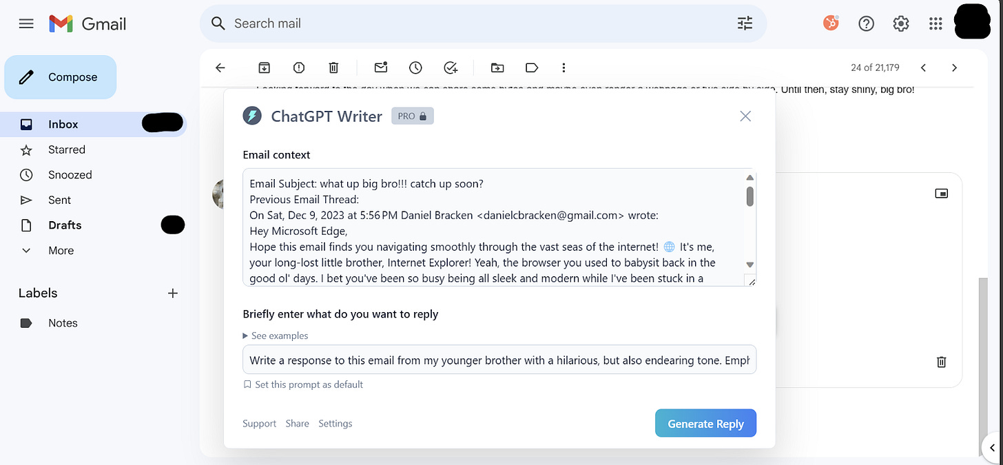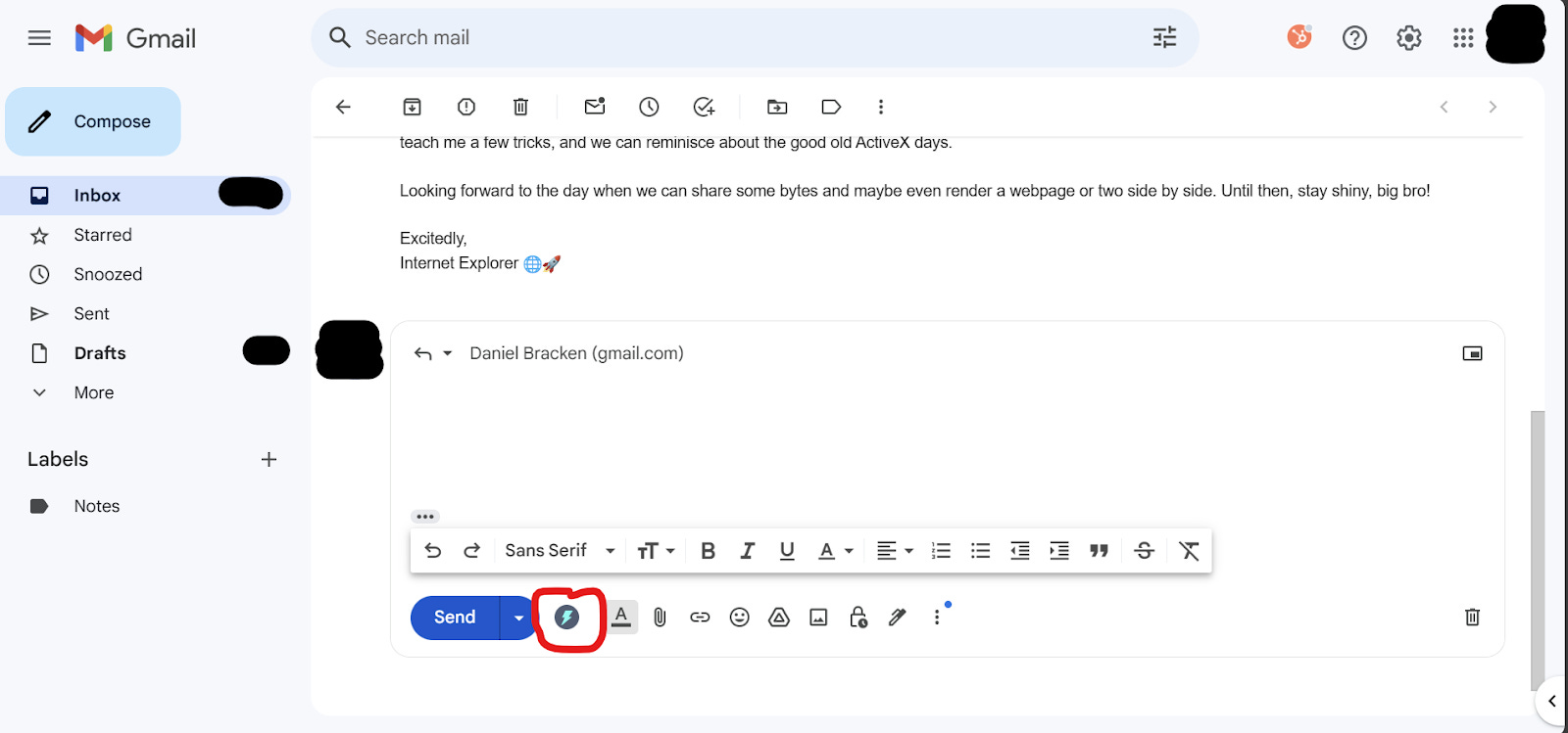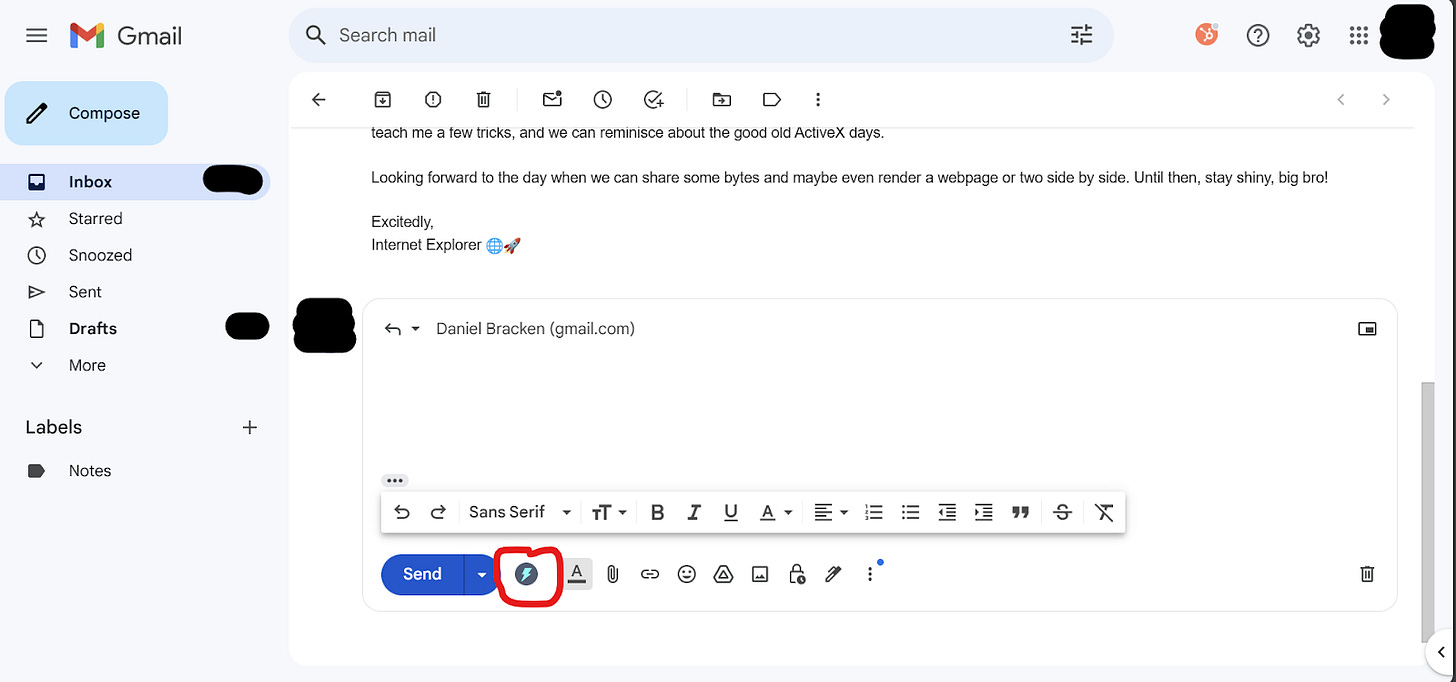 Now that we’ve got this shiny new extension, let’s take it for a test drive. I’ve been meaning to respond to an email from my younger brother that I think AI will be able to help us out with. To do this, open up your email inbox and navigate to the email that you’d like to respond to. My younger brother, Internet Explorer, has been hounding me to meet up lately. It’s been a while since I’ve seen him, and although he’s kinda slow and not super reliable, I do miss the guy…and he did write one heck of an email.