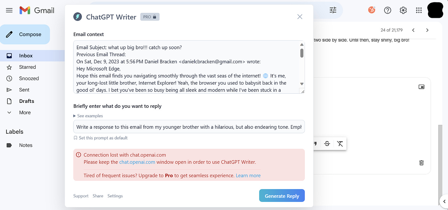 Note: When I first tried this, I ran into the following error.Apparently you need to keep a tab open with your ChatGPT account set up. Hop on over to chat.openai.com and sign in or create an account to continue. You’ll notice that after you click ‘Generate Reply’ with the extension that it will generate a new chat instance for you inside of ChatGPT. Pretty sweet! Once I had my ChatGPT tab up, it generated a response in just a few seconds, and I couldn’t have written it better myself…like, eerily so. From here, if you’re happy with your output, click on ‘Insert Generated Response’ to move forward with ChatGPT’s response.