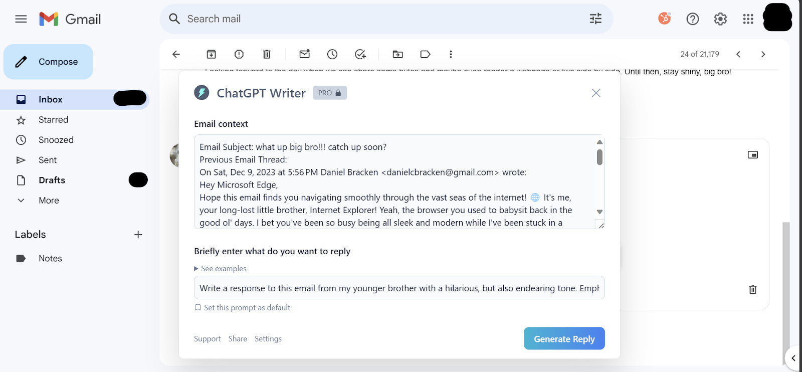 Next, I’m going to type out how I want the AI to respond to my brother’s email, aka my ‘prompt’, exactly as if I was crafting one on the ChatGPT website. I’m going to provide some specifics for the tone of my response since I want it to be equally hilarious, but also endearing. I haven’t seen him in a while after all. And yes, I think I am cool with a meetup. But I do need him to get a sense for how important my time is. Let’s see what ChatGPT (via this extension) can do for us. Here is the sample prompt: