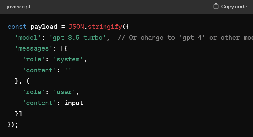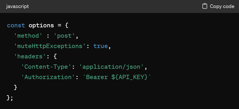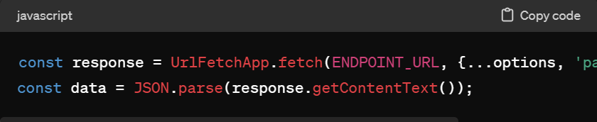 - Send Request to ChatGPT. - Use the - UrlFetchApp.fetch()method to send the request and store the response: